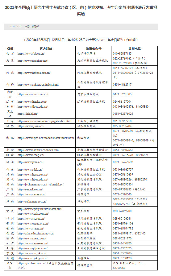 據教育部網站消息,2021年全國碩士研究生招生考試將於12月26日至28日舉行,全國報考人數為377萬。為方便考生及時了解招生政策、考試安排、疫情防控要求等信息,順利參加考試,同時嚴厲打擊涉考違法活動,嚴肅考試紀律,維護考生合法權益,教育部同時公布了2021年全國碩士研究生招生考試各省(區、市)信息發布、考生諮詢與違規違法行為舉報等渠道。