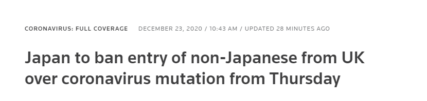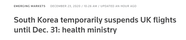 據路透社報道,當地時間23日,日本、韓國宣布實施對英國旅行禁令。其中,日本將從當地時間24日起禁止從英國來的非日本國民入境。韓國在當地時間23日宣布將暫停英國航班入境,直至12月31日。此外,韓國停止對英國外交使團的檢疫豁免,並將將發燒標準從37.5度調整為37.3度,並加強對機組人員的檢查。(圖源:路透社)