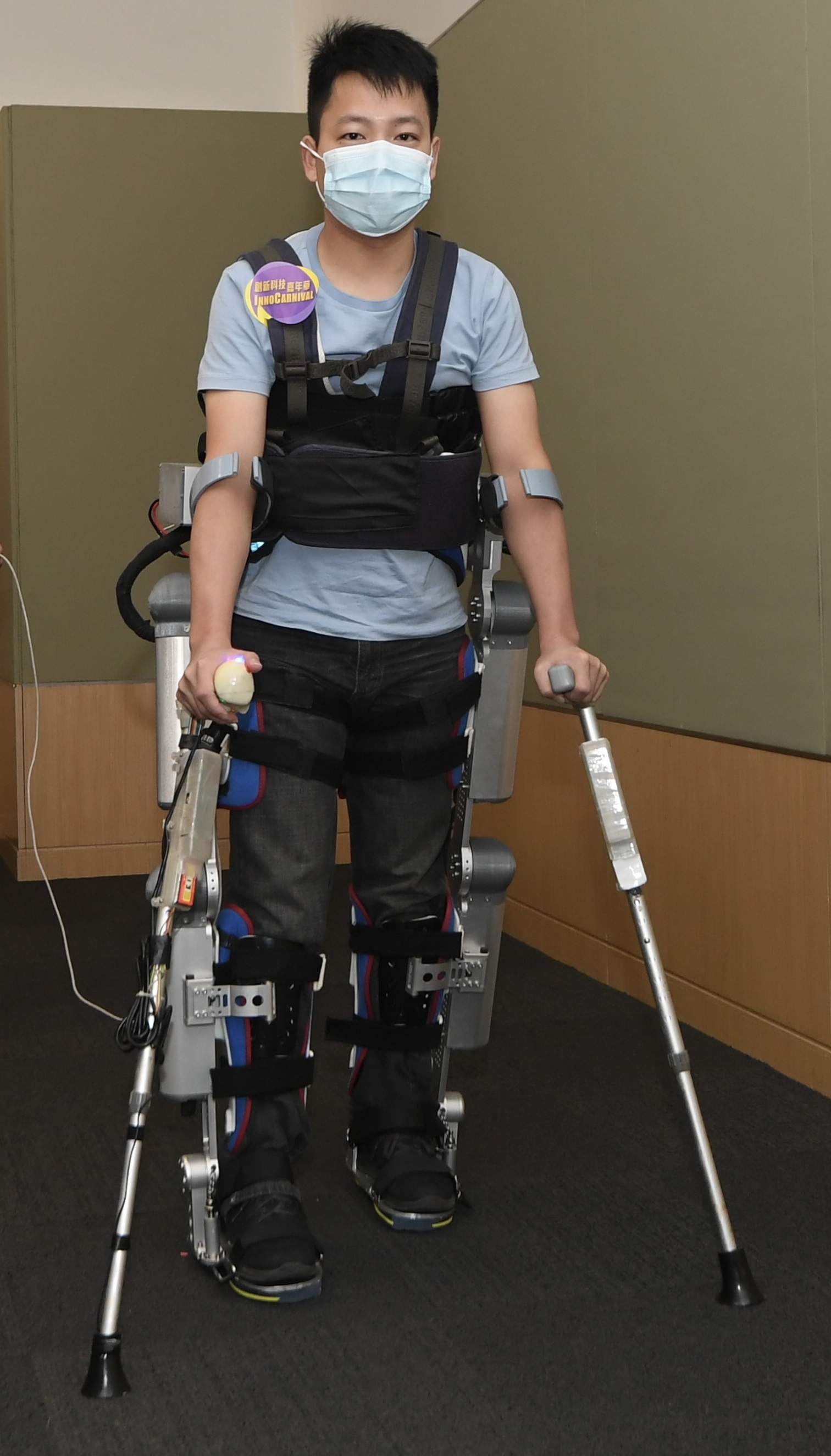 由中文大學研發的「用於步行輔助的穿戴式外骨骼」。該項發明有助癱瘓病人站立和行走,改善其健康和生活質素。