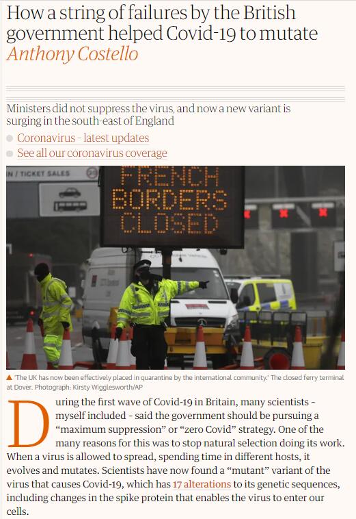倫敦大學學院全球健康與可持續發展教授科斯特洛於22日在《衛報》發表評論文章指出,在英國新冠肺炎的第一波浪潮中,許多科學家都表示,政府應該採取「最大限度的壓制」或「清零」戰略。這樣做的眾多原因之一是阻止自然選擇發揮作用。當一種病毒有條件進行傳播,並在不同的宿主中停留一段時間後,它就會進化和變異。儘管科學家頻頻發出警告,表示病毒有變異的風險,但英國政府在整個大流行期間的策略一直是減緩病毒的傳播,減輕NHS的壓力,而不是徹底將新冠病毒清除。