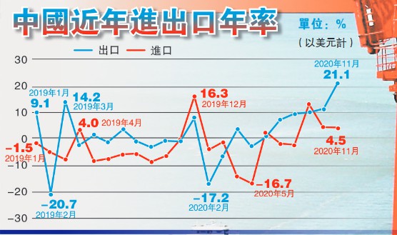 連平認為,展望2021年,很多國家的疫苗已經問世,疫情有望得到有效控制,全球經濟可能全面走向復蘇,各國生產能力都會得到一定程度的恢復。雖然這肯定會導致中國外貿面臨的競爭比今年更多,但全球經濟整體向好,也給中國提供了更多機會,中國貨物的需求也會更多,進出口增速仍將有所提高。再加上中國持續擴大開 放,積極擴展國際「朋友圈」,比如前不久簽訂了RCEP協定,這些對於外貿局勢來講均有積極影響,儘管這些影響才剛剛開始。值得一提的是,東盟現在是中國第一大貿易夥伴,未來的RCEP還會有更多看點。