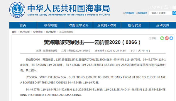 據連雲港海事局消息,雲航警0066,黃海南部,12月25日至12月31日每天0700時至1800時在34-45.948N 119-19.728E、34-49.977N 119-18.947E、34-52.688N 119-20.308E、34-51.861N 119-23.816E和34-48.533N 119-23.554E諸點連線範圍內進行實彈射擊。禁止駛入。