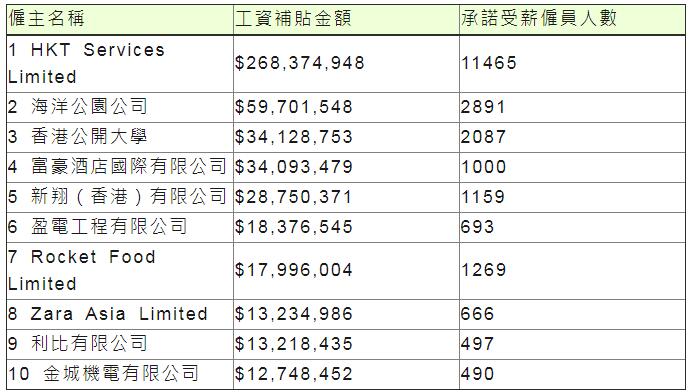 第二位為海洋公園,獲5970萬元補貼,承諾聘用2891人;香港公開大學排第三名,獲補貼3412萬元,承諾受薪僱員2087人。另外,跨國連鎖服裝店Zara Asia Limited排第八位,獲補貼1323萬元,承諾聘用666人。