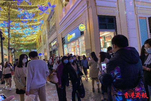 在灣仔利東街,大批市民在商場的布置前拍照留念,但市民均有戴上口罩。(