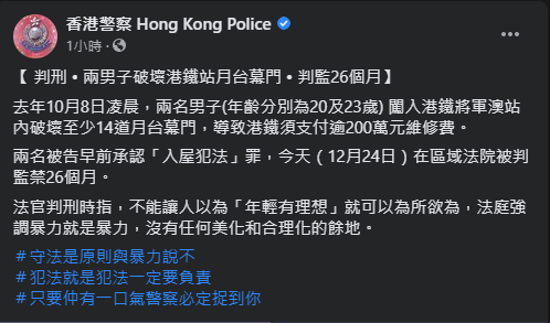 24日,警方在社交平台表示,1名20歲及23歲男子於今日(24日)在區域法院承認「入屋犯法」罪,被判監禁26個月。