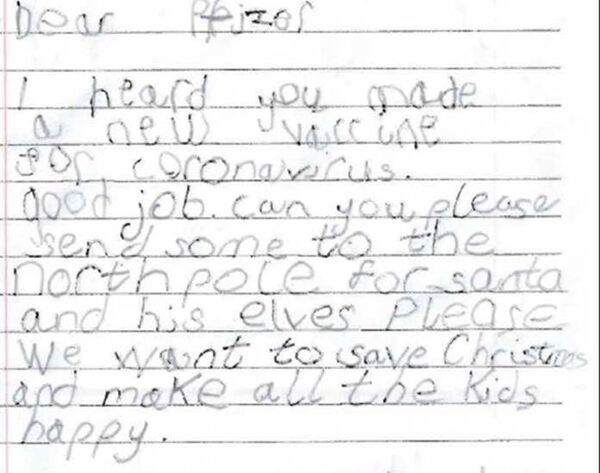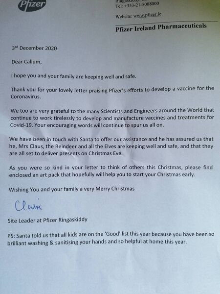 據愛爾蘭媒體《Irish Examiner》當地時間24日報道,一名6歲愛爾蘭男孩卡勒姆(Callum Thornhill)11月初給輝瑞公司(Pfizer)寫信,詢問他們是否可以寄疫苗給聖誕老人和小精靈們。大約兩周後,卡勒姆收到了輝瑞董事長兼CEO艾伯樂(Albert Bourla)的回信。
