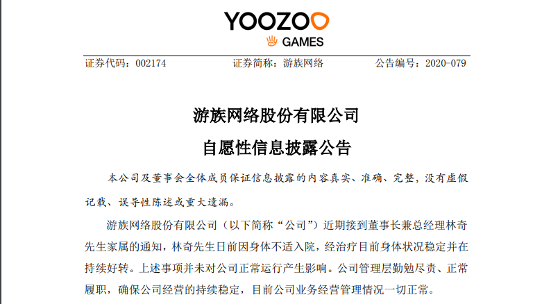 12月23日晚,深交所上市公司游族網絡披露公告。公告稱,近期接到董事長兼總經理林奇家屬的通知,林奇日前因身體不適入院,經治療目前身體狀況穩定並在持續好轉。
