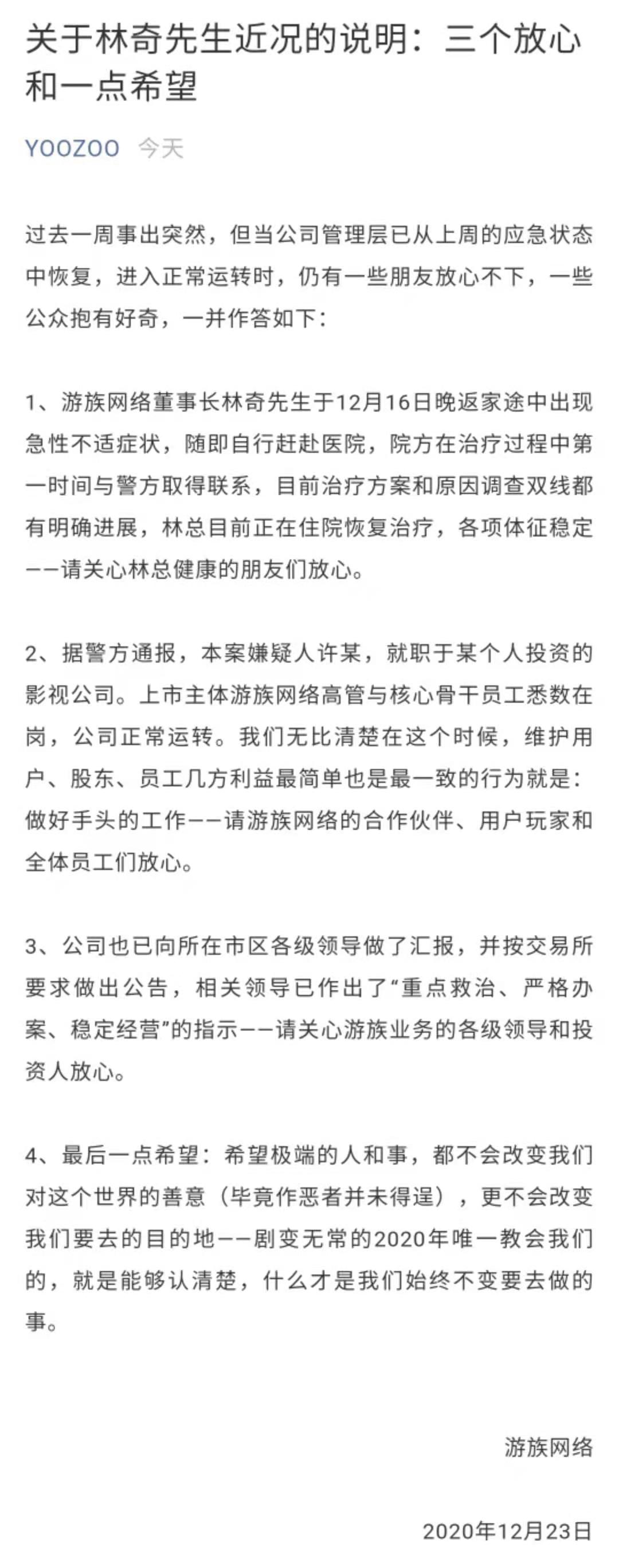 其一,游族網絡董事長林奇先生於12月16日晚返家途中出現急性不適症狀,隨即自行趕赴醫院,院方在治療過程中第一時間與警方取得聯繫,目前治療方案和原因調查雙線都有明確進展,林總目前正在住院恢復治療,各項體徵穩定——請關心林總健康的朋友們放心。