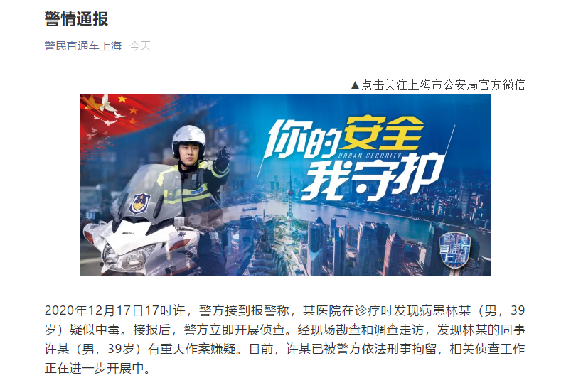當日,「警民直通車上海」發布的警情通報顯示,12月17日17時許,警方接到報警稱,某醫院在診療時發現病患林某(男,39歲)疑似中毒。