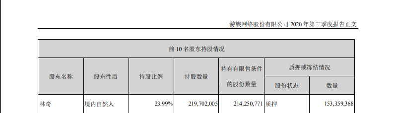 截至今年三季度末,林奇個人持有游族網絡23.99%的股份,為公司第一大股東。