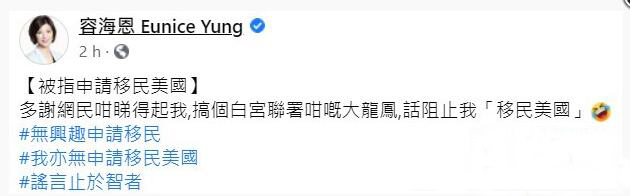 容海恩今日在Facebook專頁上表示,有關傳聞並不屬實,「無興趣申請移民」,亦「無申請移民美國」,認為「謠言止於智者」,更打趣指「多謝網民咁睇得起我,搞個白宮聯署咁嘅大龍鳳」。