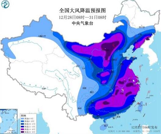 27日白天起,強冷空氣將開始影響新疆北部,未來將自西向東自北向南影響我國中東部大部地區,帶來大風和強降溫天氣。預計28日至31日,中東部大部地區氣溫將下降8~10℃,西北地區東部、東北地區東南部、華北西部和北部、黃淮南部、江淮、江南、華南中北部等地降溫12~14℃,局地降溫幅度可達14℃以上;降溫過後,最低氣溫0℃線將南壓至華南北部一帶,最低氣溫-10℃線在黃河下游到秦嶺一帶;中東部大部地區將有4~6級、陣風7~9級偏北風,我國東部和南部海區有7~9級、陣風10~11級偏北風。