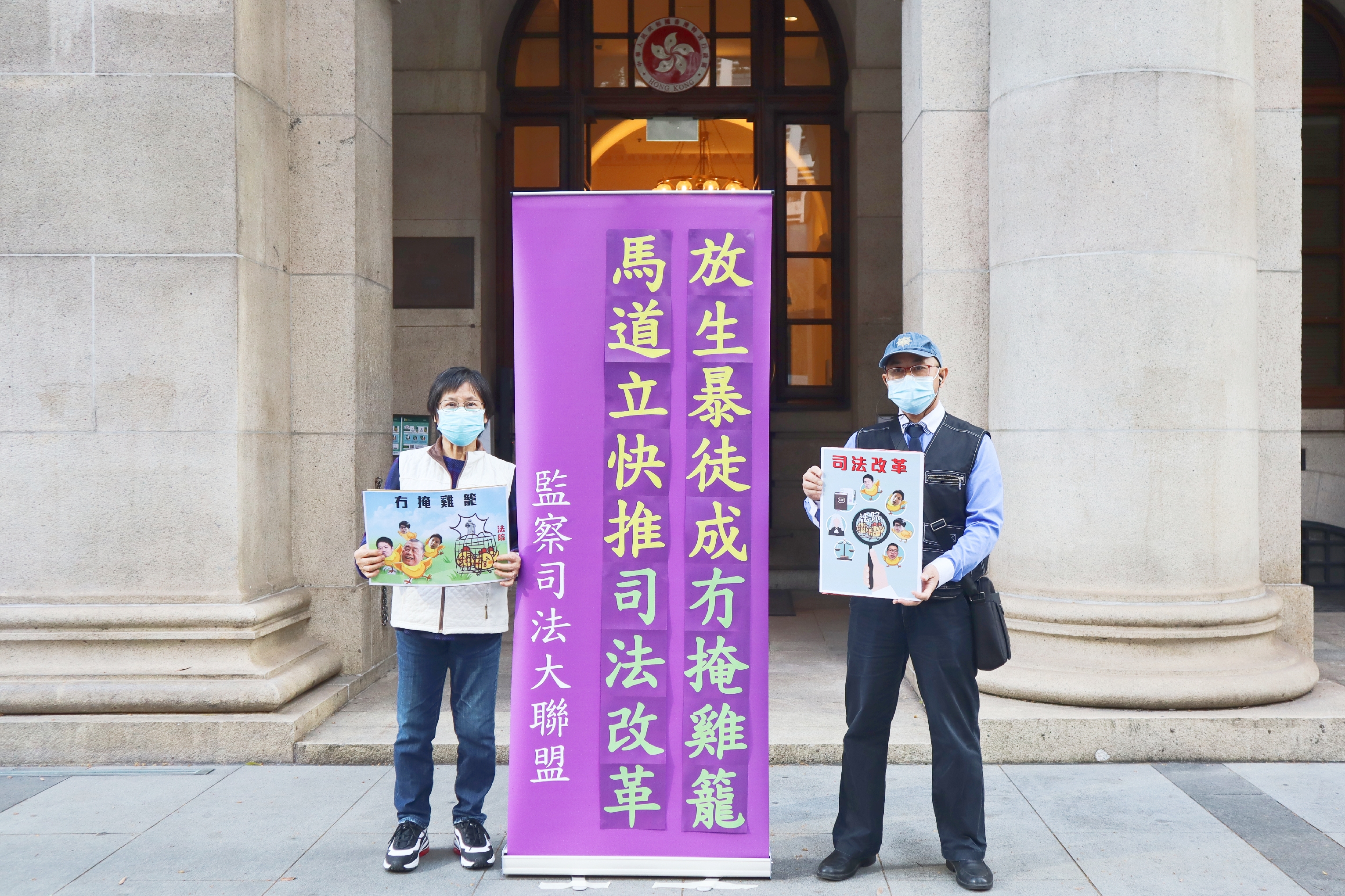 民間團體「監察司法大聯盟」今日(28日)到終審法院外請願,兩名代表拉起「放生暴徒成冇掩雞籠 馬道立快推司法改革」橫額,並高呼「暴徒棄保潛逃 法院冇雞籠」、「改革司法制度 還我公正嚴明」等口號,請願人士向終院代表遞交請願信後和平散去。