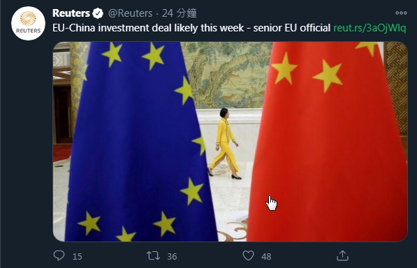 路透社報道稱,一名歐盟高級官員周一表示,中國和歐盟可能在本周達成一項投資協議,該協議將使歐盟公司更好地進入中國市場,並為其資產提供保護。