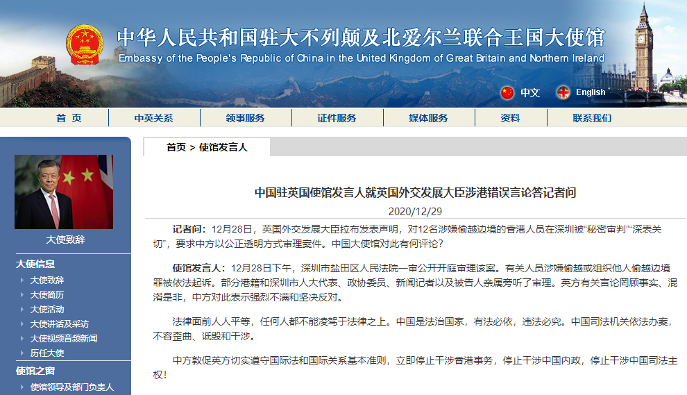 記者問:12月28日,英國外交發展大臣拉布發表聲明,對12名涉嫌偷越邊境的香港人員在深圳被「秘密審判」「深表關切」,要求中方以公正透明方式審理案件。中國大使館對此有何評論?