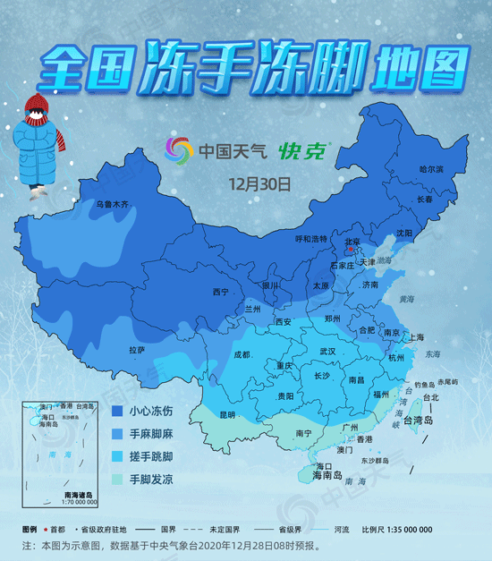 12月30日至31日,東北地區大部和內蒙古中東部等地將是全國最冷的地方,大城市中,哈爾濱、長春、呼和浩特最低氣溫都會低於零下20℃。「問世間冷為何物,直教人手腳凍傷」,當地公眾請儘量減少外出,外出時儘量裝備齊全,防止凍傷。