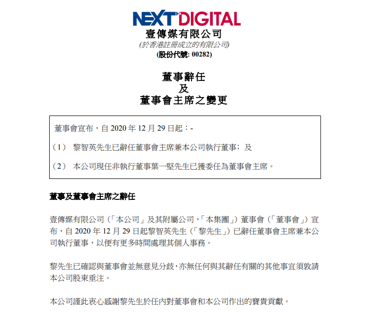 壹傳媒(00282)宣布,即日起黎智英辭任董事會主席兼執行董事,以便有更多時間處理其個人事務。現任非執行董事葉一堅接任主席。