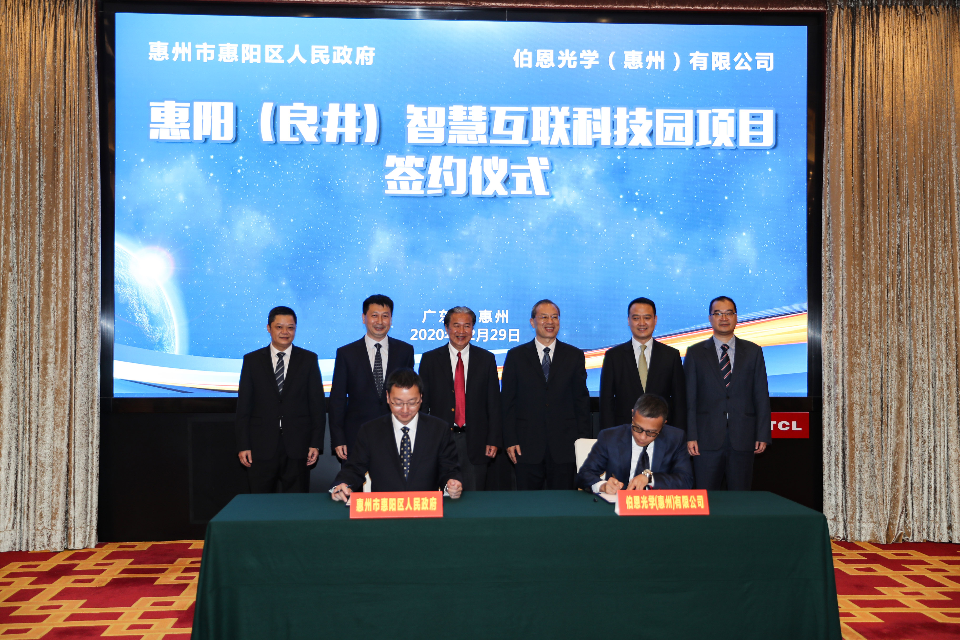 惠陽區區長譚星海(前左)與伯恩光學(惠州)有限公司行政總裁施展芳(前右)上台簽署《惠陽(良井)智慧互聯科技園項目合作框架協議》,惠州市委書記李貽偉(後排右三),市長劉吉(後排左二),市委常委、秘書長、市政府黨組成員余金富(後排右二),惠陽區委書記翟偉鋒(後排右一)、伯恩光學(惠州)有限公司總裁楊建文(後排左三)在台上見證。