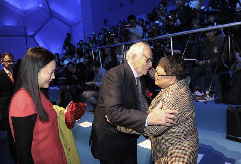 2012年4月1日,服裝品牌皮爾·卡丹在北京水立方舉行時裝發布會,鄧小平之女鄧林與皮爾·卡丹熱情擁抱。 (中新社)