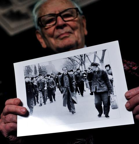 2013年12月2日,法國巴黎,皮爾·卡丹展示一張拍攝於1978年的老照片。 (新華社)