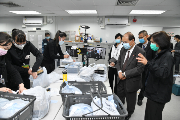 張建宗(右三)在建築署署長何永賢(右四)及民眾安全服務處總參事方耀堂(右二)的陪同下,視察分派飯盒的情況。