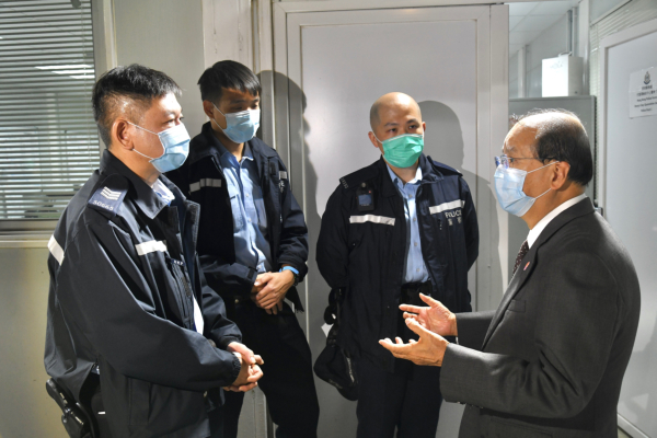 張建宗(右一)與駐守檢疫中心的警務人員交談。