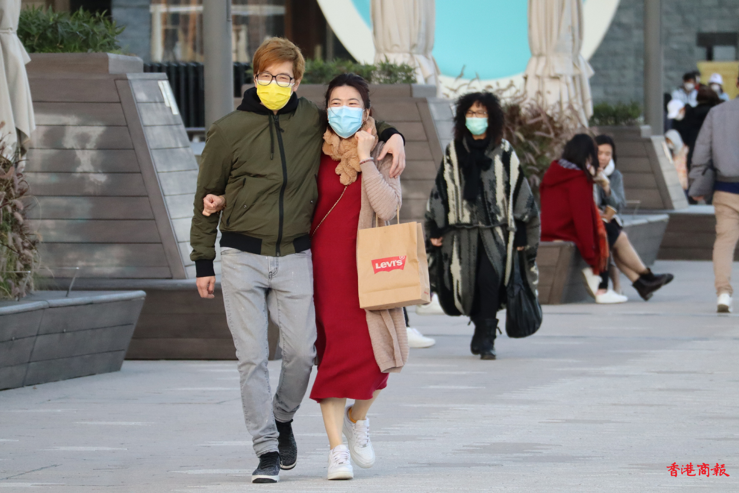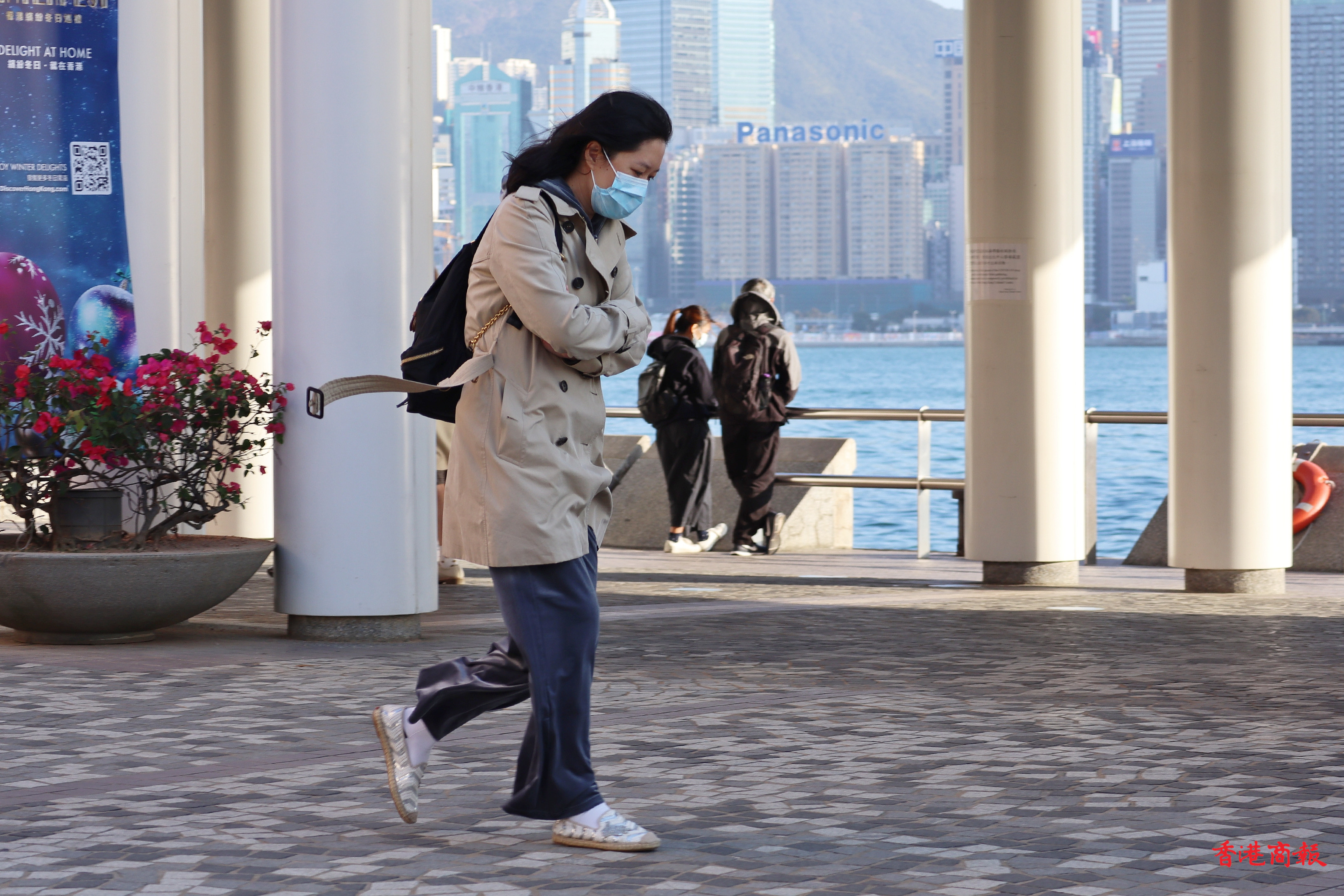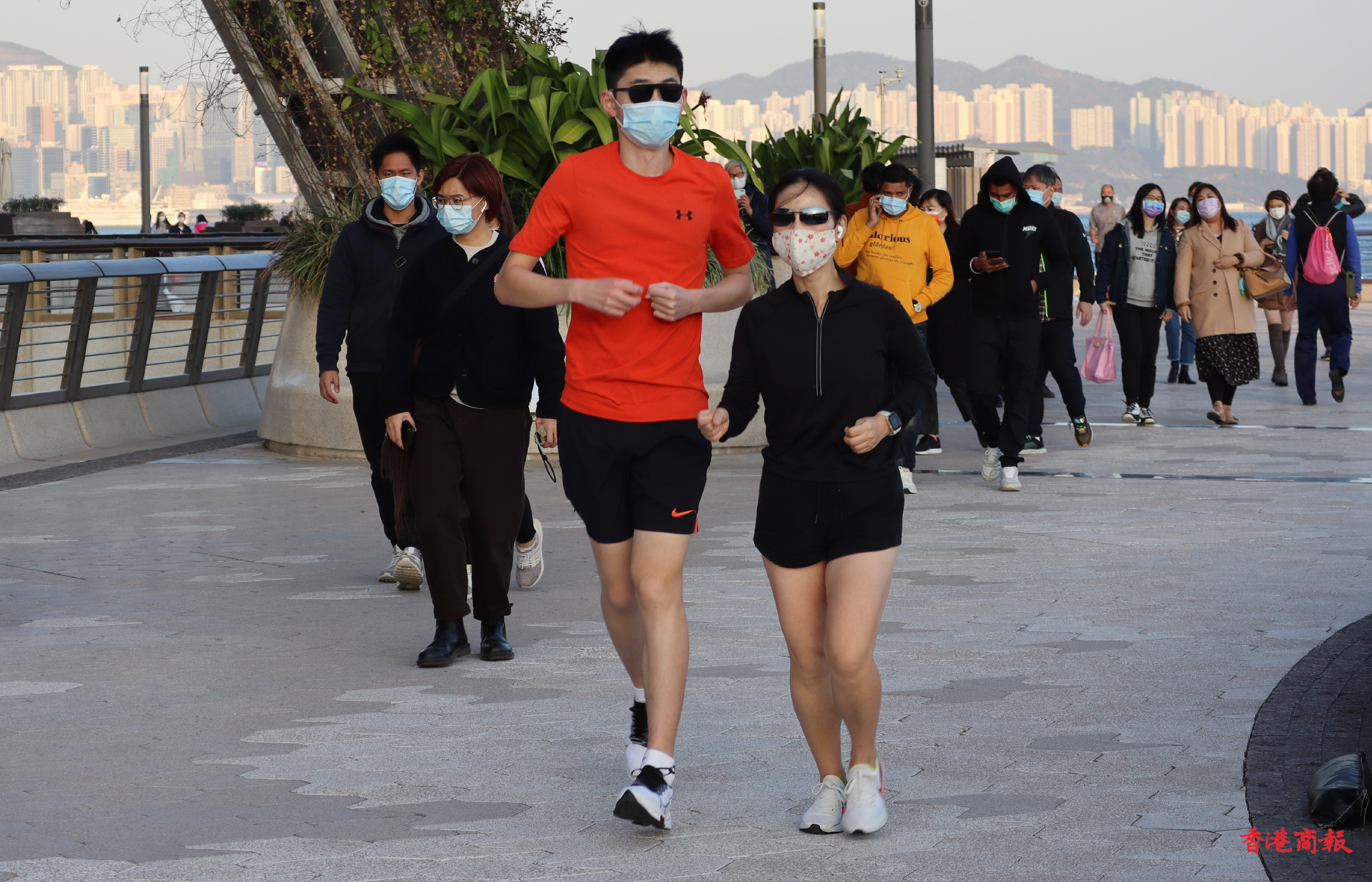 在街上的市民都加穿厚衣抵禦寒冷天氣,亦有不少市民無懼刺骨的北風在尖東海傍跑步;亦有穿著單薄衣服的女士在拍照,與穿著羽絨褸的人形成強烈對比。(馮瀚文 攝)
