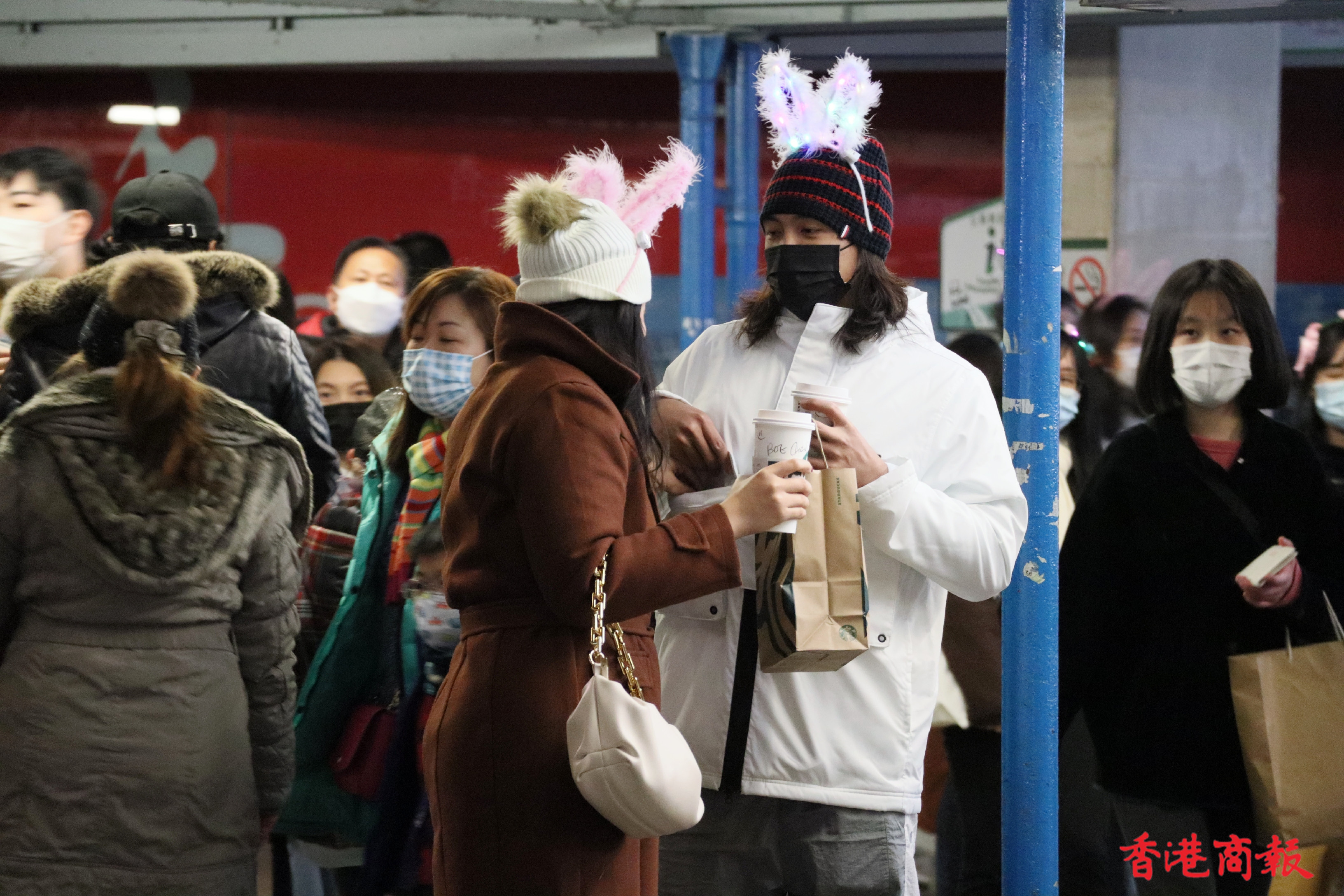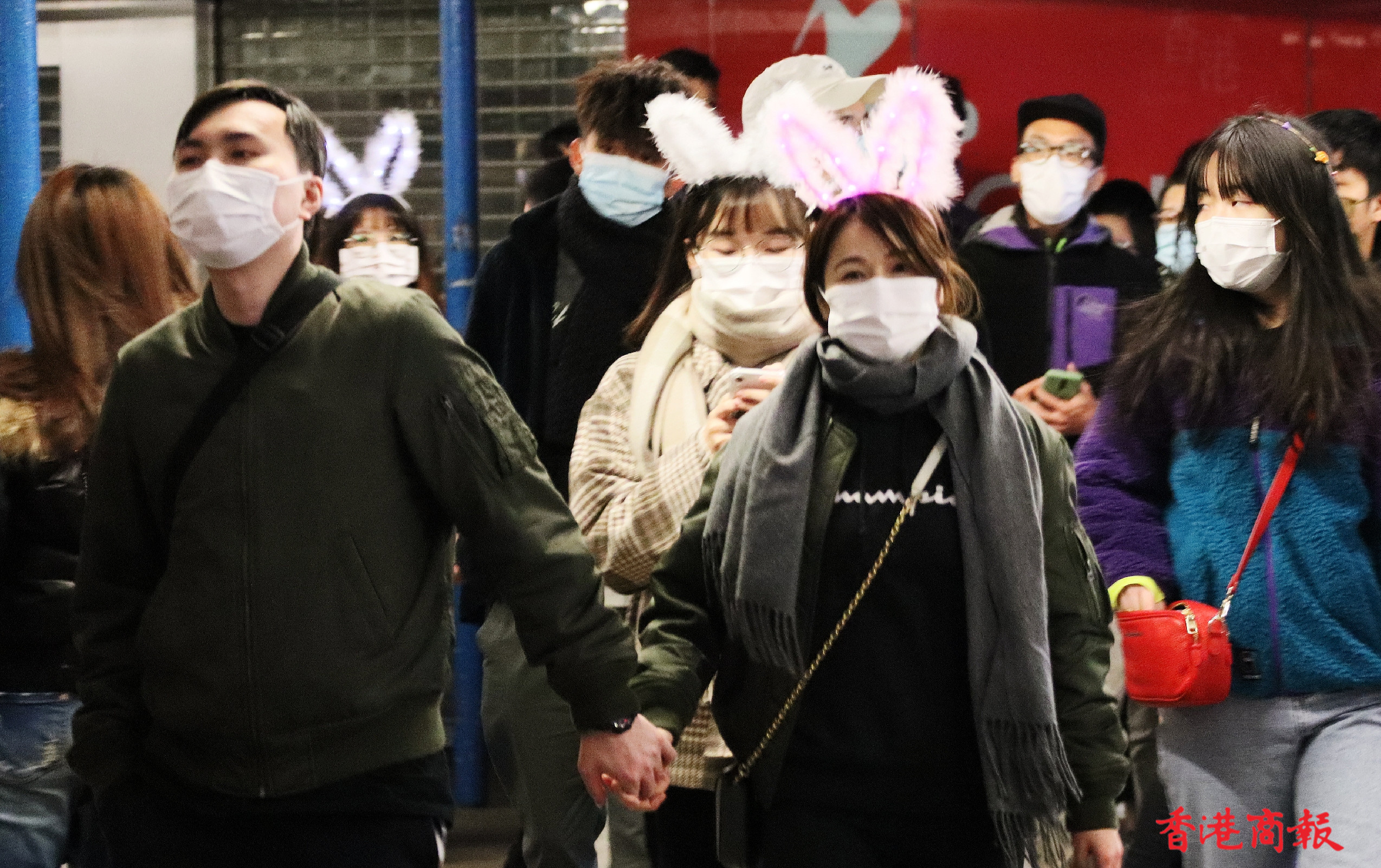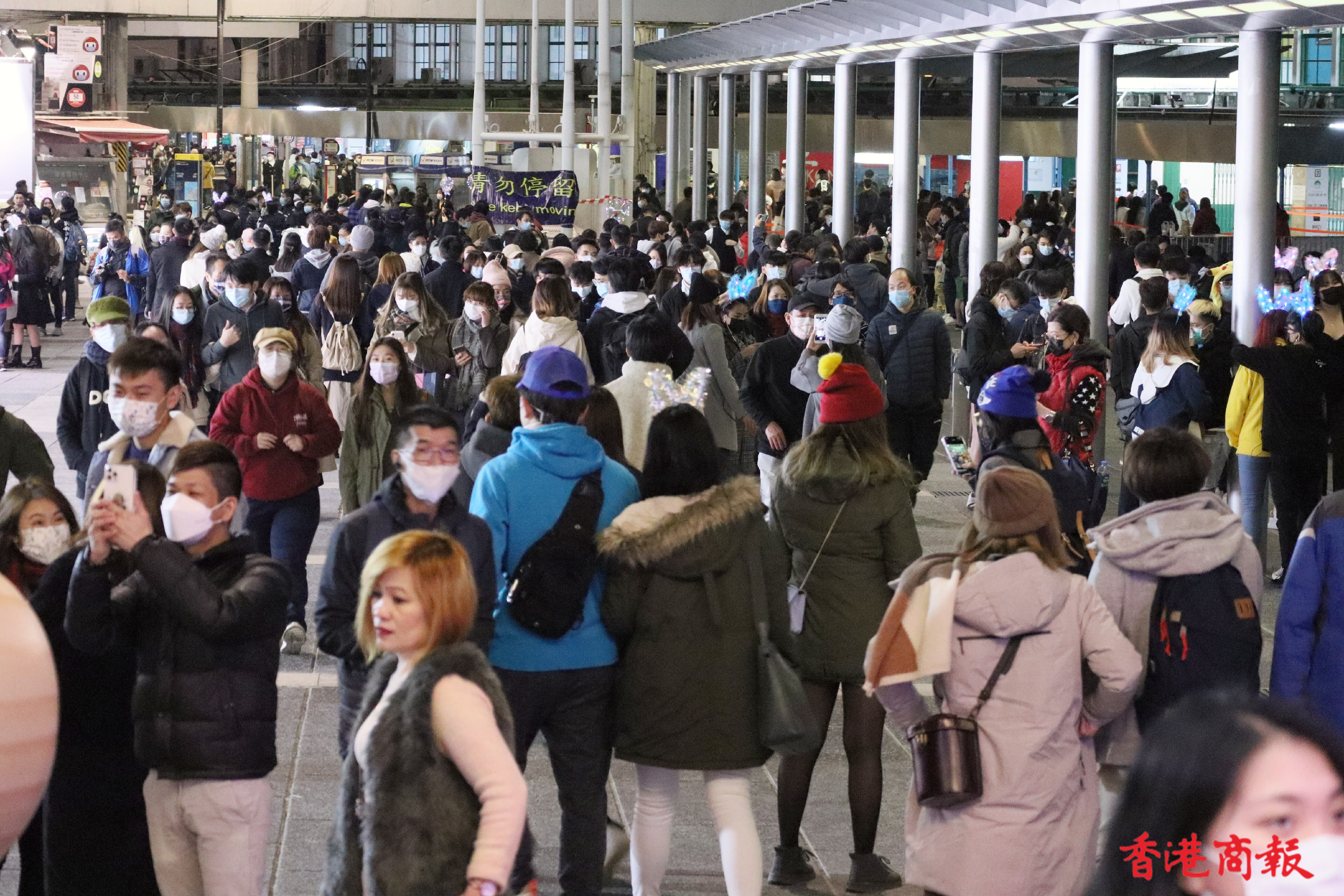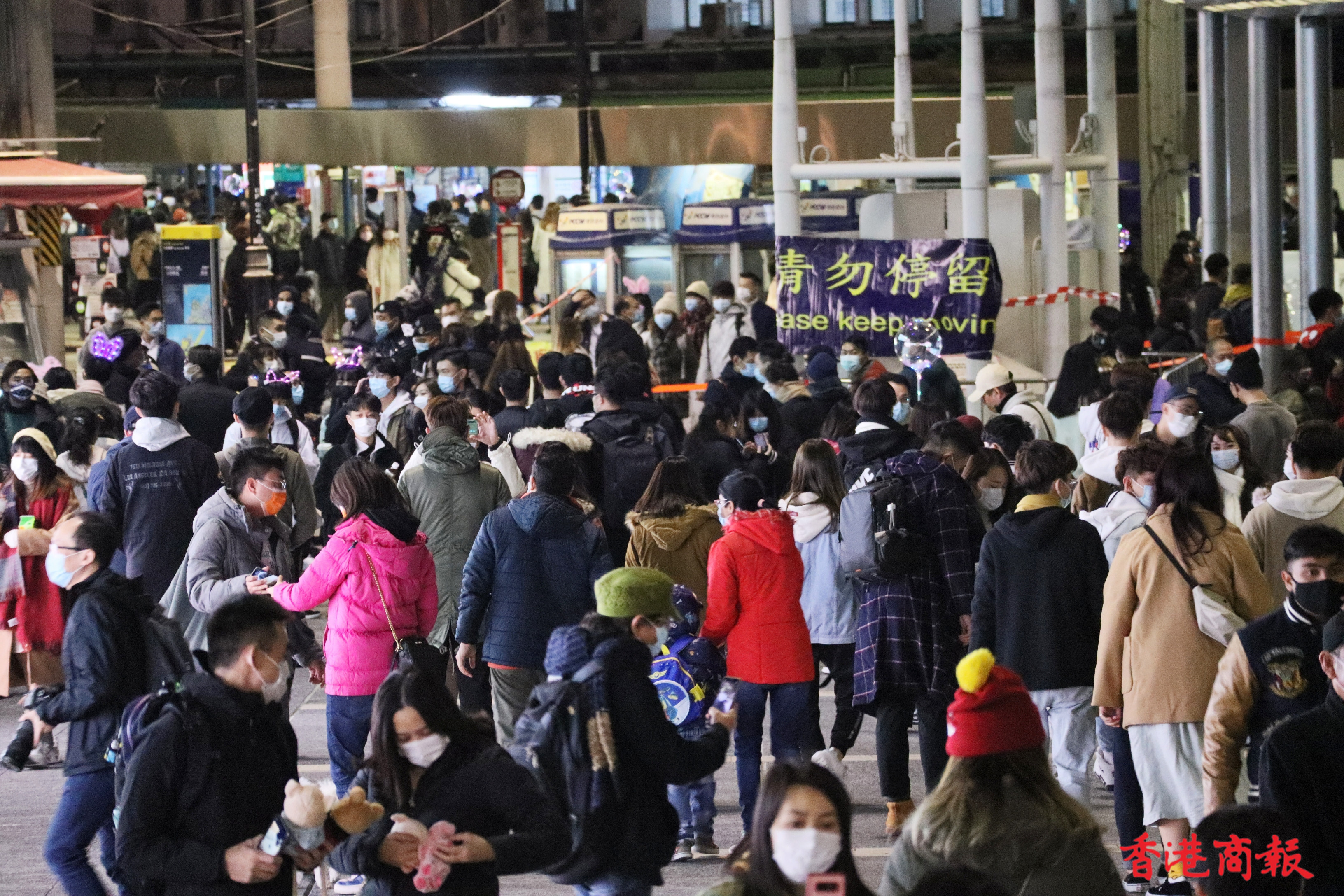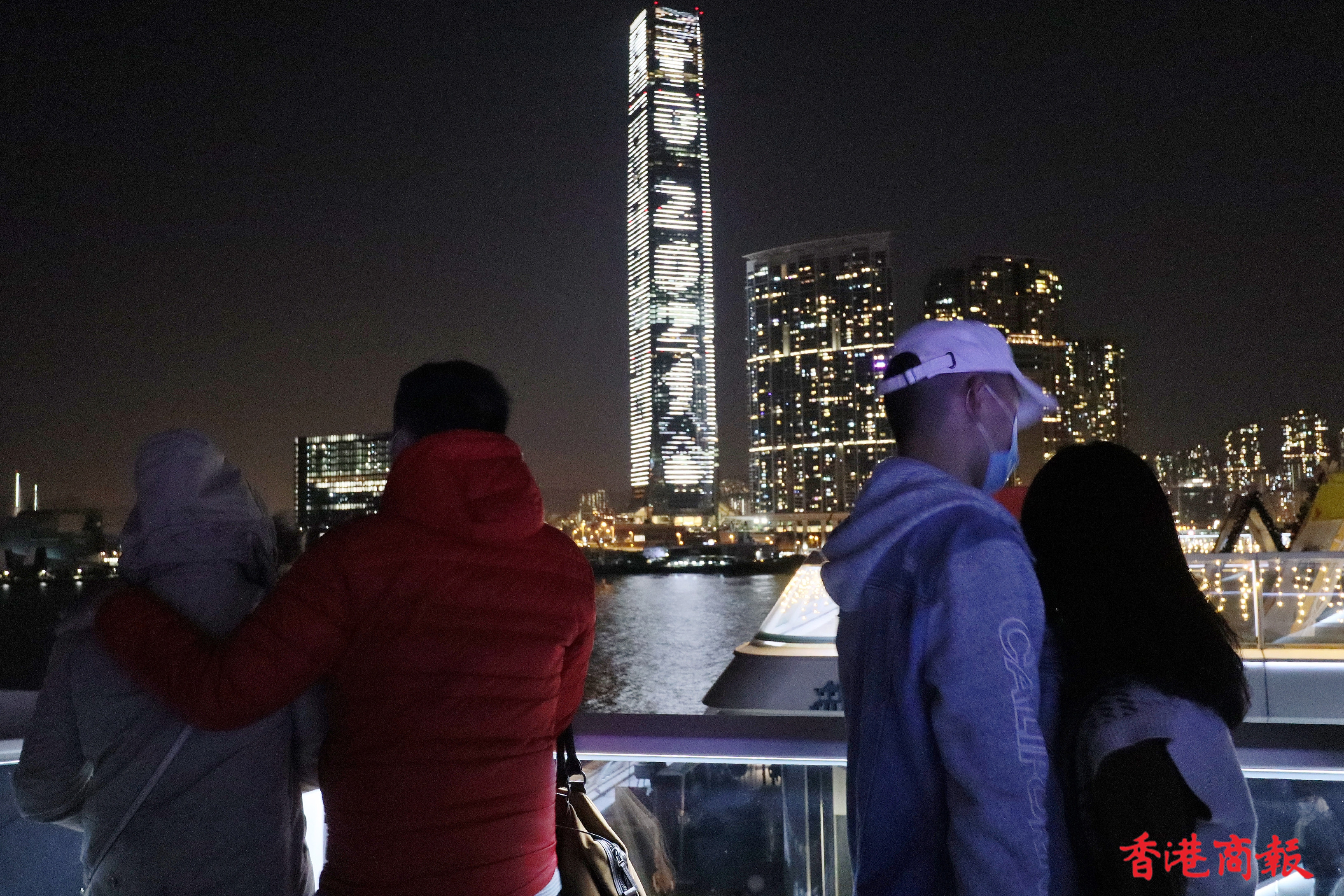 除夕維港沒有官方倒數活躍、沒有激光表演、沒有璀燦煙花,但尖沙咀碼頭一帶仍有不少市民聚集。環球貿易廣場外牆有倒數顯示,吸引不少市民駐足觀看並一起倒數,到零時零分一起呼叫「Happy new year」算是整晚氣氛最好的一刻。(馮瀚文 攝)