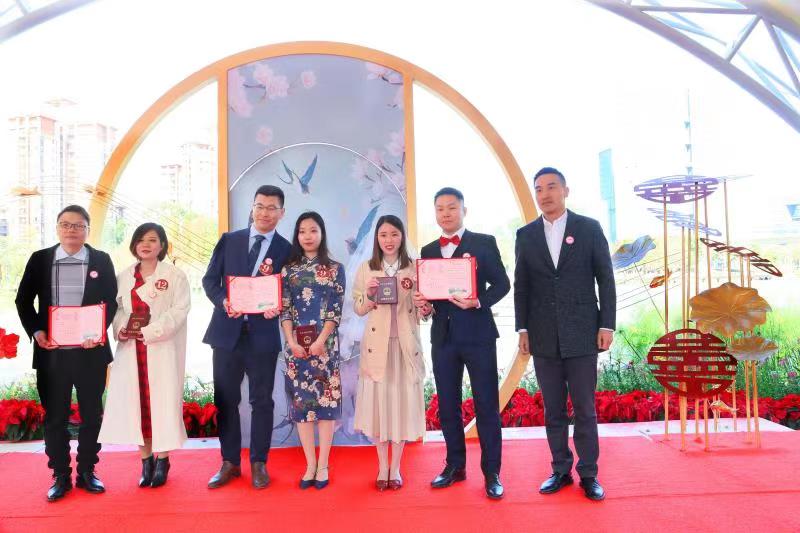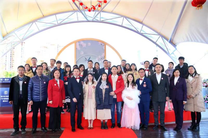 南沙區委宣傳部常務副部長、區文明辦主任鄭康(前排右三)等南沙區民政局局長鄧思卉(前排左三)、南沙區婦聯主席麥羨貞等領導作為特邀頒證師,為新人們頒發了結婚證書並送上真摯祝福。