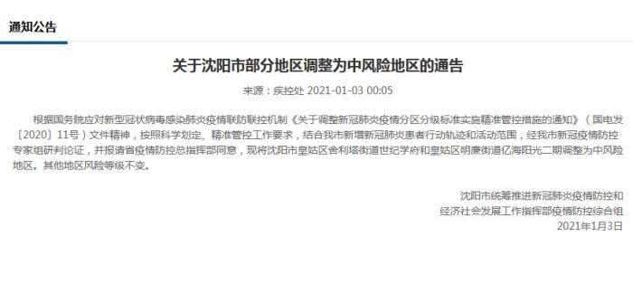 通告稱,根據國務院應對新型冠狀病毒感染肺炎疫情聯防聯控機制《關於調整新冠肺炎疫情分區分級標準實施精準管控措施的通知》(國電發〔2020〕11號)文件精神,按照科學劃定、精準管控工作要求,結合瀋陽市新增新冠肺炎患者行動軌跡和活動範圍,經瀋陽市新冠疫情防控專家組研判論證,並報請省疫情防控總指揮部同意,現將瀋陽市皇姑區舍利塔街道世紀學府和皇姑區明廉街道億海陽光二期調整為中風險地區。其他地區風險等級不變。