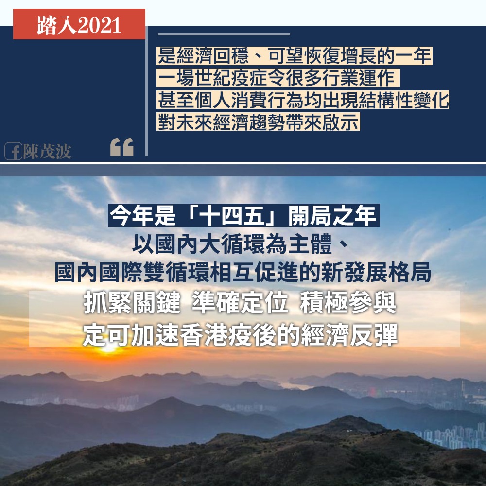 陳茂波說,今年是「十四五」開局之年,國家將加快形成以國內大循環為主體、國內國際雙循環相互促進的新發展格局。積極參與國內國際雙循環的發展,將為香港創造更廣闊的發展空間。