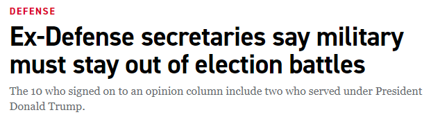 他們在《華盛頓郵報》上寫道:「美國的選舉和由此產生的權力和平轉移是我們民主的標誌」,並補充說,美國國防機構的每個人都必須「避免任何破壞選舉結果或阻礙新團隊成功的政治行動。」他們明確表示,不支持特朗普以任何方式推翻選舉的企圖。
