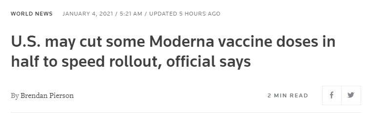 當地時間3日,路透社援引美國聯邦政府官員的話表示,「美國政府在考慮給部分人注射一半劑量的莫德納疫苗以實現疫苗的快速接種!」當日,美國累計新冠確診病例已超2050萬,累計死亡超過35萬例。