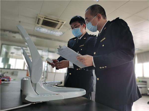 佛山海關駐禪城辦事處工作人員對進口智能坐便器產品質量進行檢驗(王磊攝)