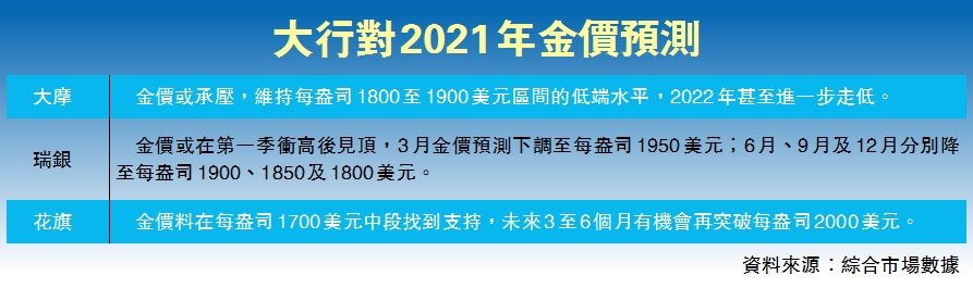 大行對金價能否再挑戰高位存在分歧,但普遍均預期金價今年可企穩每盎司1700美元之上。大摩認為,隨收益率曲線可能逐漸變陡,美國可能即將開始減碼貨幣刺激措施,料金價或因此承壓,維持金價每盎司1800至1900美元區間的低端水平,2022年甚至進一步走低。