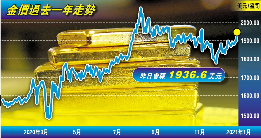 踏入第三季,金價更現突破,且越升越有,單是7月升幅便達11%,創下2012年以來最大單月升幅,直迫每盎司2000美元。至8月初正式攻破每盎司2000美元關,高見每盎司2073美元,創下歷史新高。不過,金價創新高後「高處不勝寒」,去年8月中旬以來反覆回落,一度低見每盎司1760美元水平,足足較高位調整15%。不過,去年12月起反覆回升,截至昨日傍晚,在每盎司1930美元水平。分析普遍認為,金價此輪調整,主要與疫苗面世令避險需求下降,經濟復蘇預期升溫,以及黃金消費需求疲弱等有關。