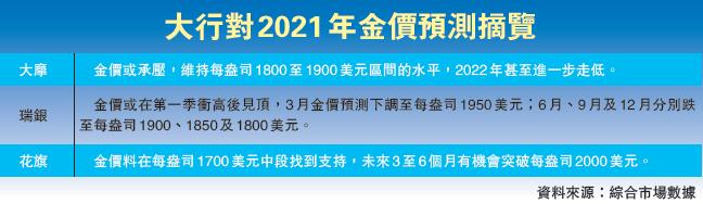 大行對金價能否再挑戰高位存在分歧,但普遍均預期金價今年可企穩每盎司1700美元之上。大摩認為,隨收益率曲線可能逐漸變陡,美國可能即將開始減碼貨幣刺激措施,料金價或因此承壓,維持金價每盎司1800至1900美元區間的低端水平,2022年甚至進一步走低。