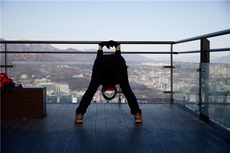 韓國首爾,一名女子在山頂做伸展運動。