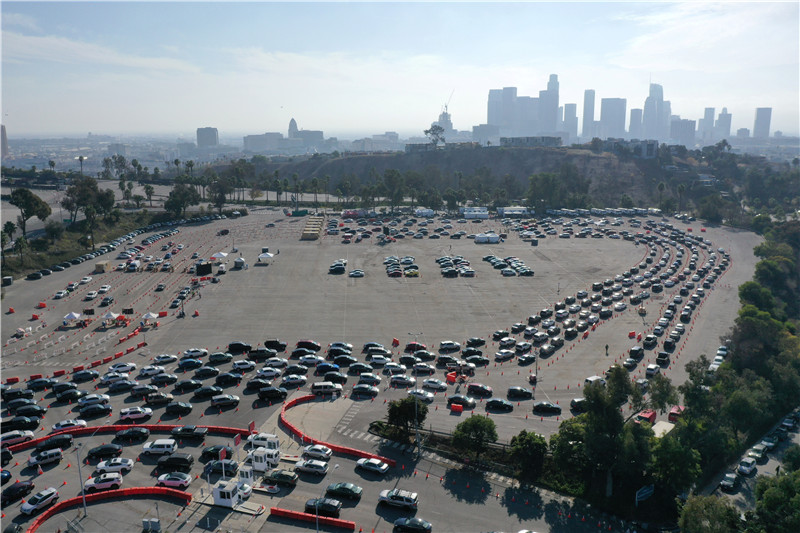 美國加州洛杉磯道奇體育場,人們在車里排隊接受新型冠狀病毒檢測。