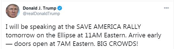 他說:「我將於東部時間明天上午11時在(白宮附近)橢圓形公園舉行的『拯救美國集會』上發表演講。早點來——東部時間早上7時會開門。(會有)擁擠的人群!」