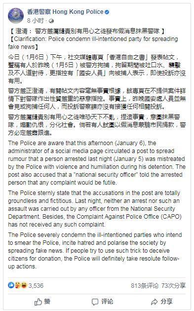警方昨日晚在Facebook發文表示,6日下午,社交媒體專頁「香港自由之書」發表帖文,聲稱有人於1月5日晚被警方拘捕,拘留期間被吐口水、襲擊及不人道對待,更指控有「國安人員」向被捕人表示,即使投訴亦沒有用。