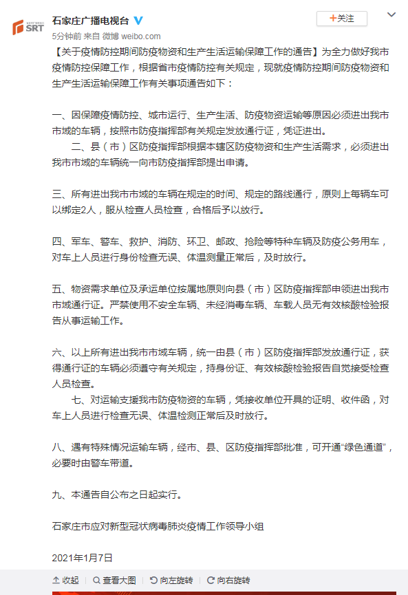 石家莊廣播電視台1月7日發布關於疫情防控期間防疫物資和生產生活運輸保障工作的通告。通告顯示,因保障疫情防控、城市運行、生產生活、防疫物資運輸等原因必須進出石家莊市市域的車輛,按照市防疫指揮部有關規定發放通行證,憑證進出。(圖源:新華網)