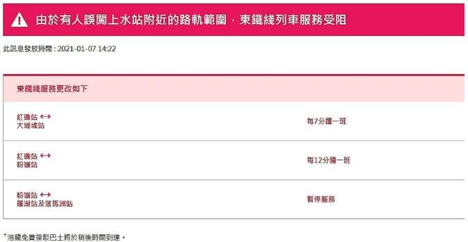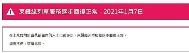 港鐵表示,有人進入上水站往紅磡方向路軌範圍。受事件影響,粉嶺站至羅湖/落馬洲站來回方向列車服務一度暫停、列車紅磡站至大埔墟站來回方向每7分鐘一班,紅磡站至粉嶺站來回方向每12分鐘一班。至下午3時07分東鐵綫列車服務陸續回復正常。(图:fb群組「香港突發事故報料區」)