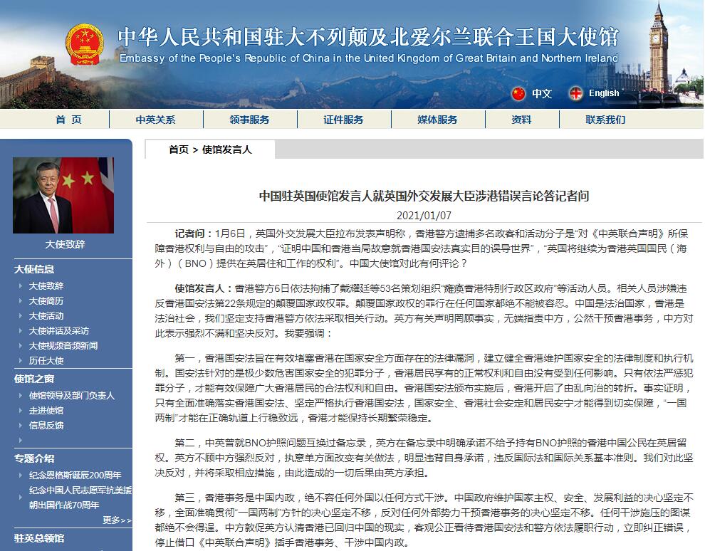 英國外交發展大臣蓝韬文6日發表所謂的聲明聲稱,香港警方逮捕多名政客和活動分子是「對《中英聯合聲明》所保障香港權利與自由的攻擊」。對此,中國駐英國大使館發言人今日(7日)回應強調,英方有關聲明罔顧事實,無端指責中方,公然干預香港事務,中方對此表示強烈不滿和堅決反對。