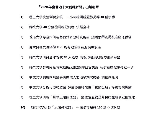 京港學術交流中心表示,大學研發新冠肺炎快速檢測法的事件是評選中上榜的新聞主題,當中有理工大學研發全自動快速多重診斷系統,1小時可檢測40種病原體;包括新冠病毒、禽流感和沙士等病毒。香港科技大學研發的檢測儀可於40分鐘確診新冠肺炎病毒,較一般檢測儀快近兩小時,以及香港大學與廈門大學等合作研發的鼻噴式新冠病毒疫苗,獲國家藥品監管局批准展開臨床試驗。