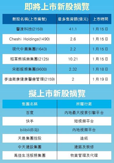 去年大量中概股來港第二上市,市場預計今年勢頭會持續。繼網易(9999)、京東(9618)、新東方(9901)等中概股之後,市傳百度與快手亦尋求來港掛牌,其中百度的集資規模將達35億美元(折合約273億港元),而快手更會籌50億美元(折合約390億港元)。