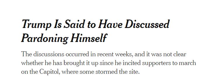 據紐約時報7日援引兩名消息人士報道,美國現任總統特朗普曾向助手表示,他希望在總統任期的最後幾天赦免自己。