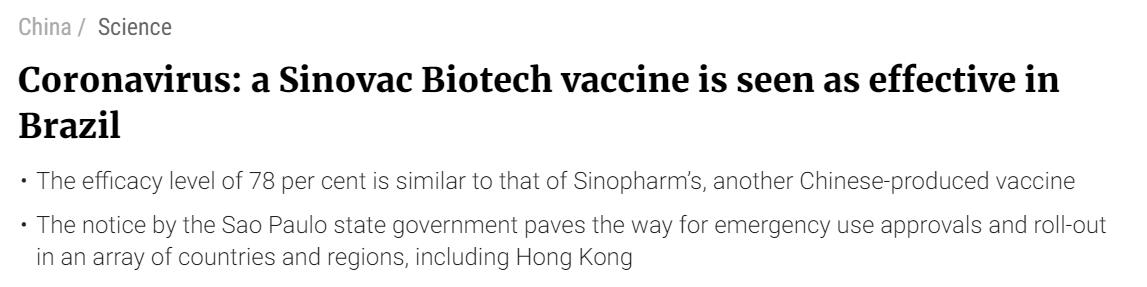 此外據南華早報8日報道,在巴西的新冠疫苗試驗中,發現由科興生物生產的疫苗對新冠病毒輕症病例的有效率為78%,對重度和中度感染的有效率為100%。