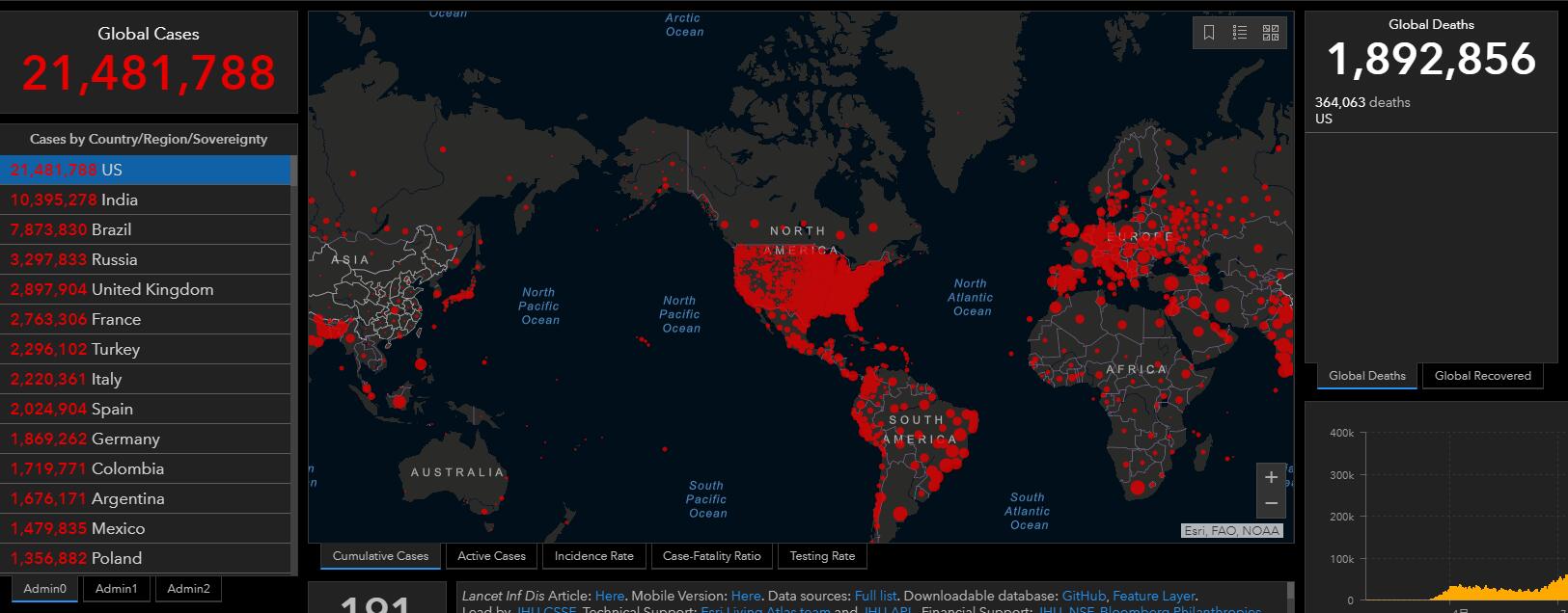 據美國約翰斯·霍普金斯大學統計數據顯示,截至香港時間8日5時22分,美國累計新冠肺炎確診病例達21481788 例,累計死亡病例達364063例。過去24小時,美國新增確診病例268441例,新增死亡病例4279例。