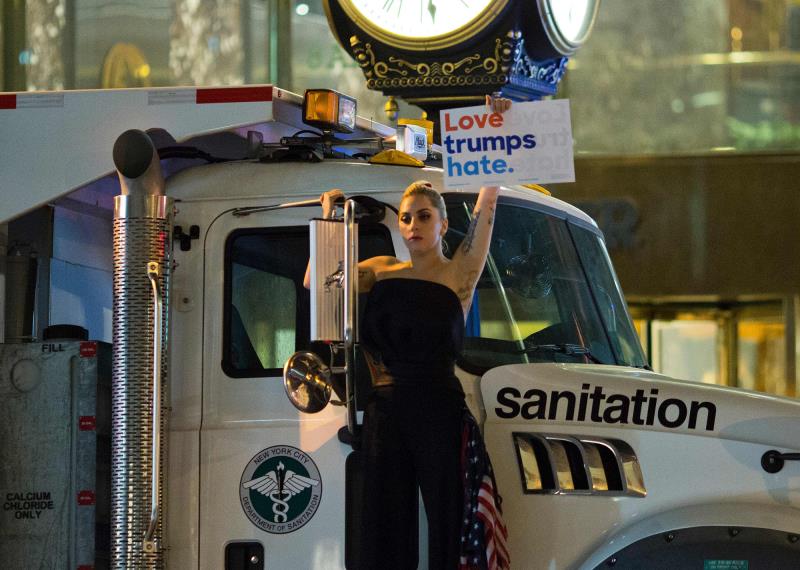 2016年特朗普當選總統後,Lady Gaga曾到特朗普大廈舉牌抗議。